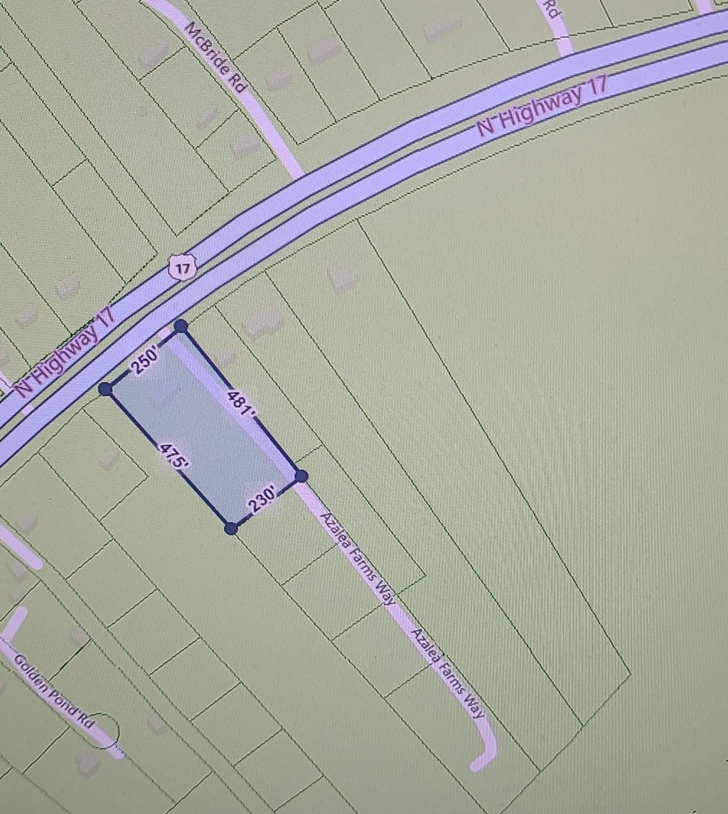 Owner will subdivide and sell 2 acres of the 2.64 acre tract located in the rear. The owner will keep the 0.64 acre that is located and fronts Highway 17 where the house is located . Access to the 2 acres will be from Azalea Farms Rd.