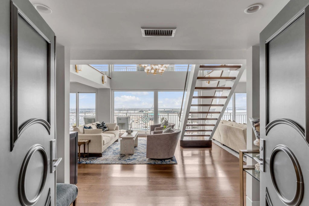 Two level penthouse unit with wide northern views of the Cooper River and Ravenel Bridge. Unit has been intelligently renovated with transitional design elements and to take full advantage of the views from every room. The sleek kitchen features Calacatta Gold marble countertops, Bosch induction cooktop, Asko dishwasher, and Kitchen Aid oven. Prime location on the peninsula allows you to walk to most of the downtown shops and restaurants, Gaillard Center, as well as Gadsdenbourough Park, which is right across the street. Condo Complex features 24/7 security, heated pool, fitness center that includes sauna, club room for parties, and a dock with water access. This unit includes two deeded parking spaces.