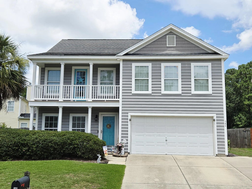 Welcome to this beautifully maintained 4-bedroom, 2.5-bath home nestled in Moss Grove community, conveniently located just off HWY 52 near Moncks Corner. With 2,358 square feet of living space, this home offers the perfect blend of Southern charm & modern comfort. Curb appeal abounds with beautiful landscaping, extra concrete parking, and striking double front porches. Step inside to find an inviting open-concept layout featuring a kitchen with an island, designated eating area, and a bright family room--perfect for entertaining. The main level also includes crown molding, a generous laundry room, and a separate dining room that can flex as an office. Upstairs, the spacious primary suite features a well-appointed bath with a double vanity, soaking tub, separate shower, and a large walk-incloset. Three additional bedrooms provide plenty of space for family or guests.