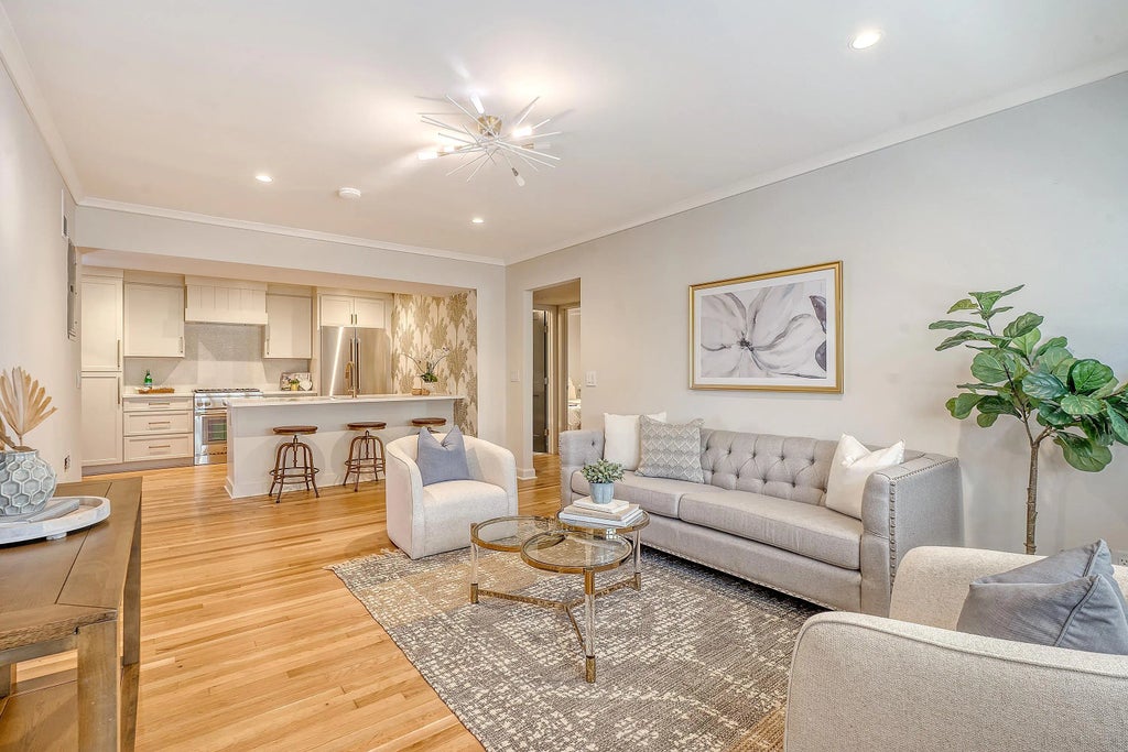 Experience elevated Lowcountry living in the heart of Charleston's prestigious South of Broad neighborhood, where historic charm meets turnkey luxury, and the lowest HOA on the peninsula adds unbeatable value!Welcome to 7 Logan Street, Unit F, a fully renovated 2-bedroom, 1-bath condo tucked away in one of the city's most beloved neighborhoods. Inside, natural light pours through oversized windows, highlighting the rich hardwood floors, and thoughtfully curated finishes throughout. The open-concept living and kitchen area is an entertainer's dream -- anchored by a custom designer kitchen outfitted with flat-front cabinetry, quartz countertops, bold statement wallpaper, and premium appliances. A built-in banquette creates a cozy dining space beneath a Visual Comfort light fixture, the ideal spot morning coffee or intimate dinners.