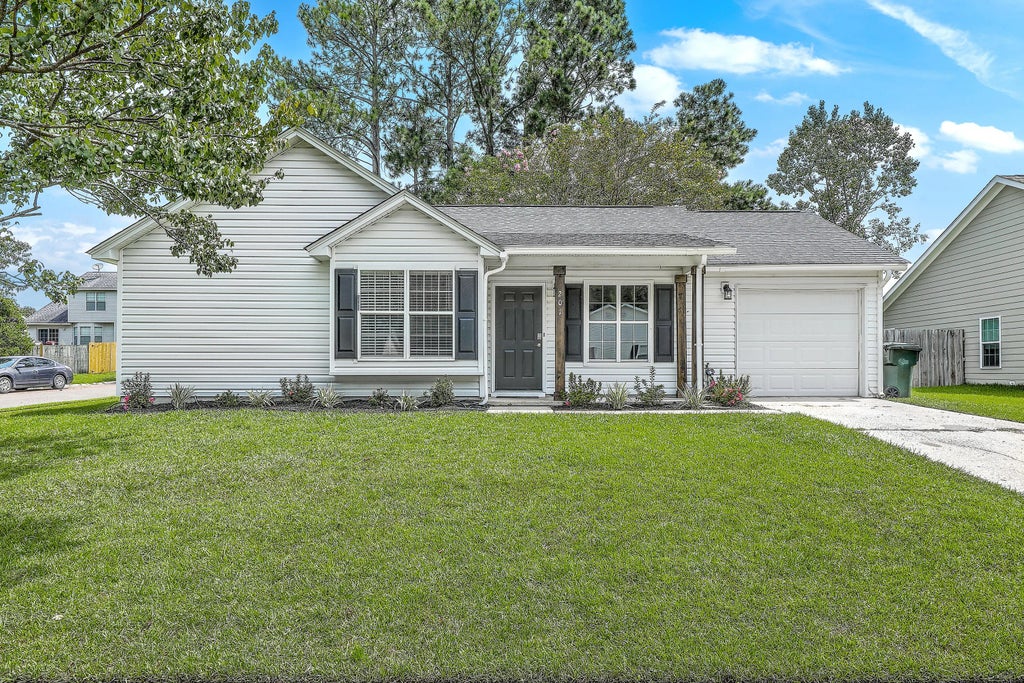 Welcome to this beautifully maintained single-story home, situated on a desirable corner lot with an open-concept floor plan and an abundance of natural light. Step inside to discover luxury vinyl plank flooring throughout, complemented by elegant chair railing and a cathedral ceiling with a fan in the spacious family room.The eat-in kitchen is designed for both functionality and style, featuring a breakfast bar for additional seating, crisp white shaker style cabinetry, a stylish chandelier, solid butcher block countertops, and a classic tile backsplash. Brand-new stainless steel appliances include a built-in microwave, dishwasher, stove and refrigerator.The primary suite offers a ceiling fan, a spacious vanity area, a water closet with a tub/shower combination, and a large walk-in closet with built-in shelving. Two additional bedrooms also feature ceiling fans for added comfort. A glass door leads to a private, fenced backyardideal for entertaining. Enjoy outdoor gatherings on the patio or around the fire pit via a charming path. The yard is perfect for children and pets alike. This home is also located just one street over from a community park and less than a mile from numerous restaurants and shopping options. Sidewalks throughout the neighborhood make it easy to walk or bike to nearby amenities. Conveniently located approximately 6 miles to I-26, 12 miles to the Naval Base, 8 miles to the hospital, 19 miles to Volvo, and 15 miles to Bosch.