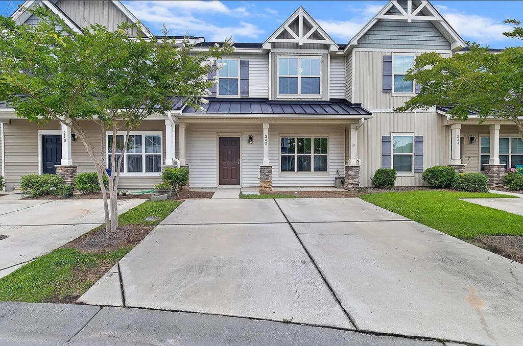 Gorgeous 2-bedroom, 2.5-bathroom + bonus room located in the Landings at Montague. This well-maintained community in the heart of Goose Creek offers quiet enjoyment and is minutes away from major commuter routes. This townhome is a pleaser offering a thoughtful floor plan and modern style. The open concept main-level invites with fresh paint, new flooring, granite countertops, and a designer accent wall. The updated layout offers comfort and practicality with tons of storage. A butler pantry, entry closet, and under-stairs storage for all your necessities, along with an outdoor closet and 2 sheds giving you room to tuck all of your holiday decorations away. A dream for a townhome of this size! Upstairs, you are greeted with a loft open feel as you retreat to your spacious primary bedroom,complete with a private bathroom and ample closet space with a smartly designed closet kit system. Your clothes are going to love the organization. Lastly, enjoy the backyard privacy of the 8-foot privacy fence and gate leading into shared green space. Located 15 minutes from the Naval Weapons Station, 25 minutes from Joint Base Charleston, and minutes away from dining, shopping, and zoned schools.