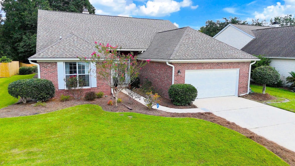 The home has extra-large gutters and is not in a flood zone. The private backyard features three low-country palm trees and privacy fences. Both the backyard and front yard are well-landscaped with crepe myrtle trees framed by palms and bushes.