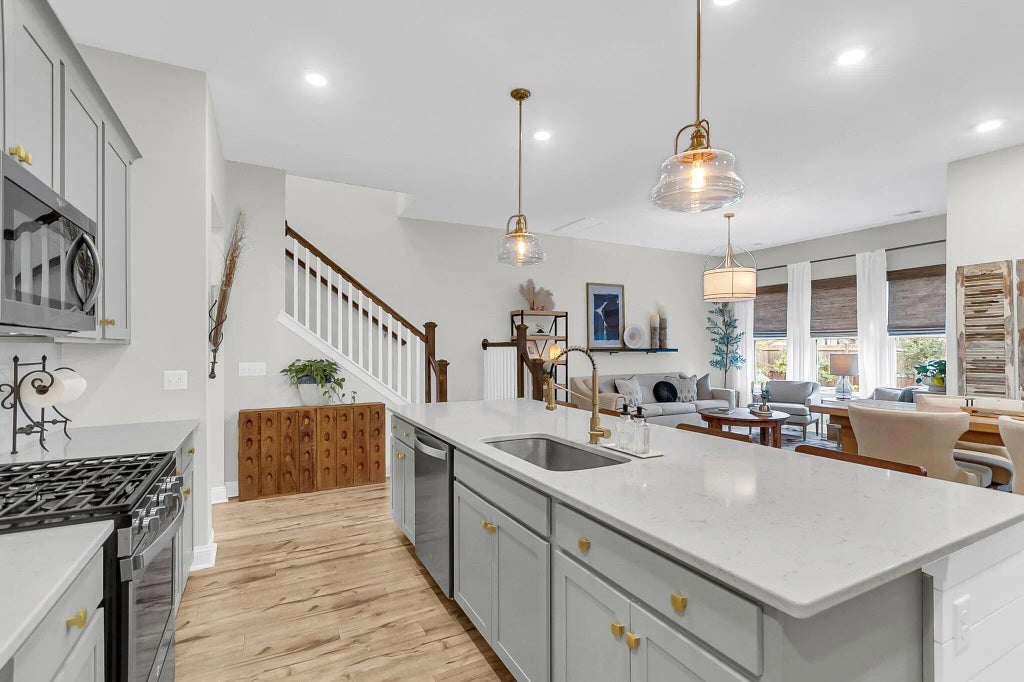 The gourmet kitchen includes an abundance of counter and prep space, a huge 9-foot island, upgraded 42" gray cabinets and white subway backsplash, Quartz countertops, stainless appliances, gas stove, and generous walk-in pantry.
