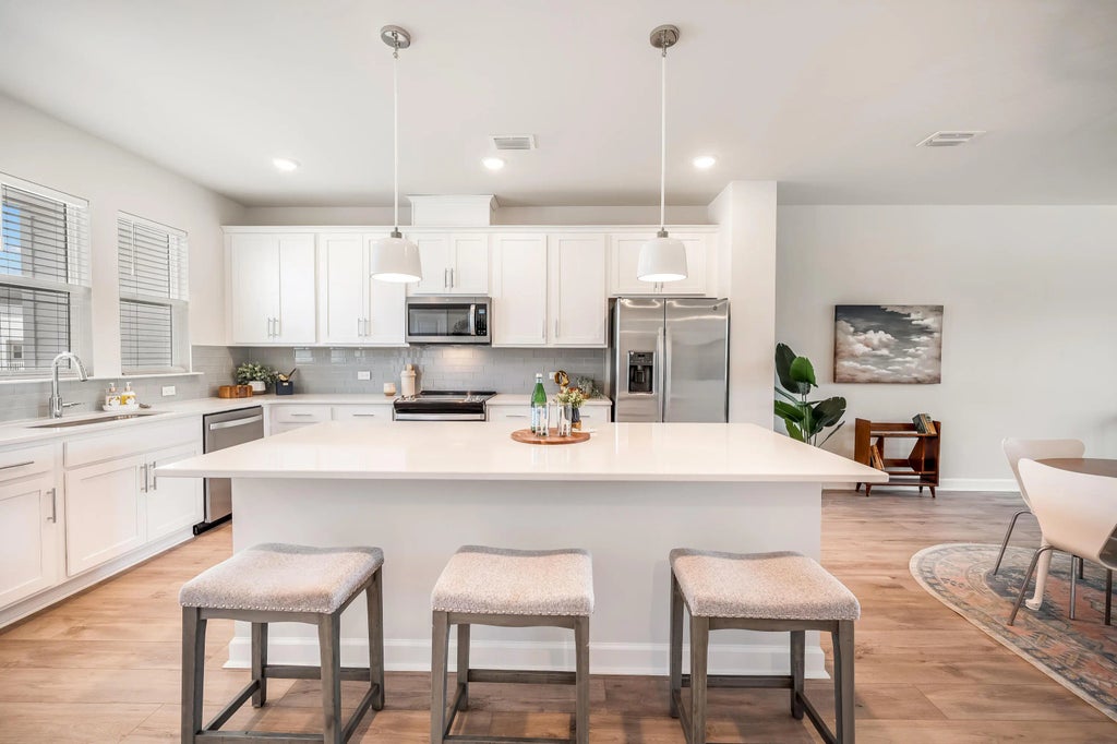 Upstairs on the second floor, the home opens into a bright, open-concept design where the kitchen, dining area, and living room flow seamlessly together. The kitchen features sleek stainless-steel appliances, a large center island with seating, and ample storage. Adjacent to the kitchen, the spacious living and dining areas make this floor perfect for both everyday living and entertaining guests.The second floor is completed with along with a private balcony that offers the perfect spot to relax and enjoy the outdoors.