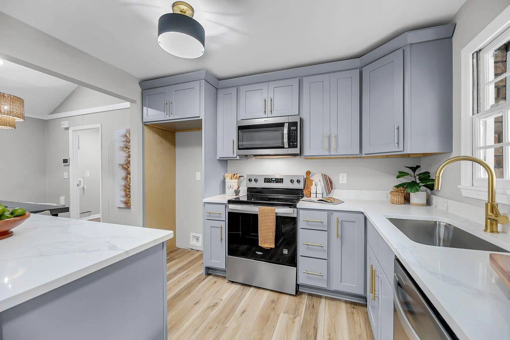 As you step inside, you'll notice the brand-new flooring that flows seamlessly throughout the home, complementing the modern aesthetic and offering both durability and style. The charming fireplace in the living room has been updated with a fresh coat of paint, giving it a crisp, modern look, and the new mantle adds a touch of sophistication to the space. The home has been meticulously transformed with smoothed ceilings and freshly painted walls, creating a bright and airy feel. Every room has been outfitted with new electrical and plumbing fixtures, ensuring modern functionality and peace of mind for years to come. The kitchen is a true standout, complete with stunning quartz countertops that provide a sleek, durable surface for meal preparation and entertaining. Thebrand-new stainless steel appliances bring both efficiency and style, while the updated hardware adds a refined touch to the space.