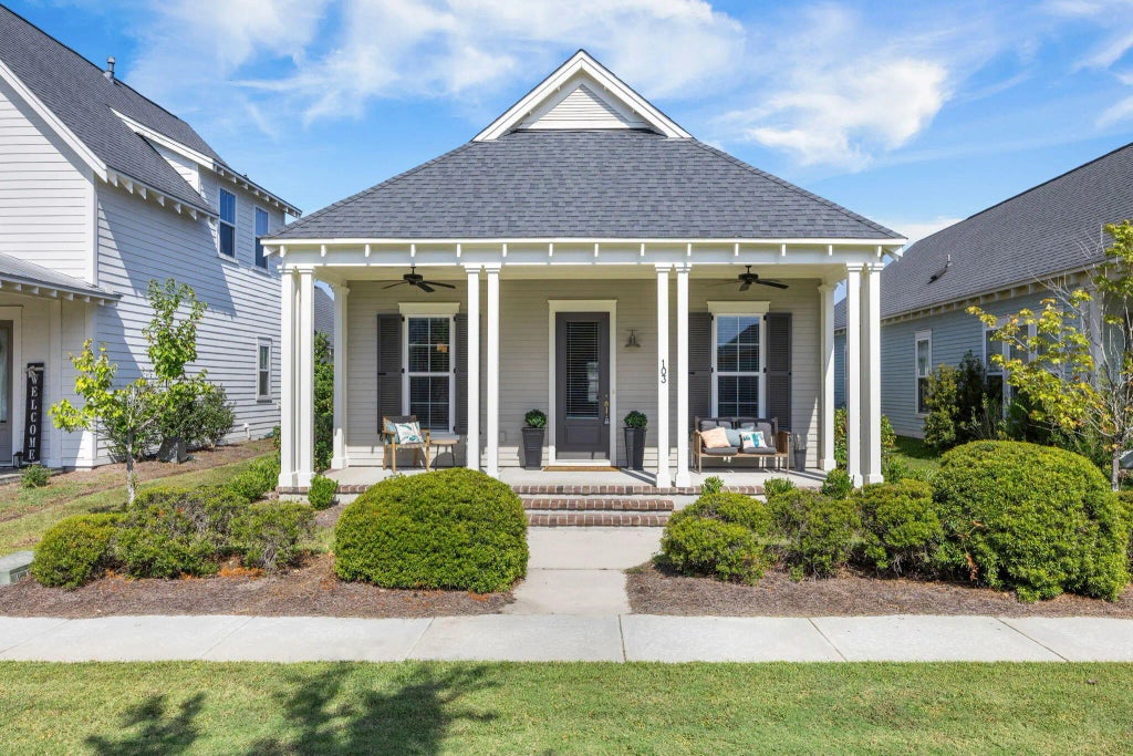 Welcome to this upgraded and inviting cottage-style 3-bedroom, 2-bath ranch home with a large front porch, perfectly situated in Brighton Park, Nexton, one of the Lowcountry's most sought-after communities. The charming porch sets the tone for the warmth and comfort you'll find inside. Step through the front door into an open-concept floor plan where the kitchen, eat-in dining area, and living room flow seamlessly together, ideal for everyday living or entertaining. Sunlight floods the space through numerous windows, creating a bright and airy atmosphere. The kitchen features white cabinets, a timeless subway tile backsplash, a center island perfect for quick breakfasts, a stylish chandelier, stainless steel appliances, and a gas range. Tucked away for privacy, the spacious primary suiteis filled with natural light and offers a double vanity, tile shower, and walk-in closet. Two additional bedrooms share a beautifully appointed guest bathroom. Enjoy warm Lowcountry days on the back patio, and take advantage of the detached two-car garage accessible from both the backyard and the side street for added convenience. Located in the award-winning, master-planned community of Nexton, you'll enjoy access to miles of scenic walking trails, resort-style pools, HOA-maintained green spaces perfect for picnics or play, pickleball courts, community parks, top-rated schools, and a vibrant town center with shops, restaurants, and entertainment. With unbeatable convenience to I-26, Volvo, Boeing, and Historic Downtown Charleston, this home offers the perfect blend of lifestyle and location.